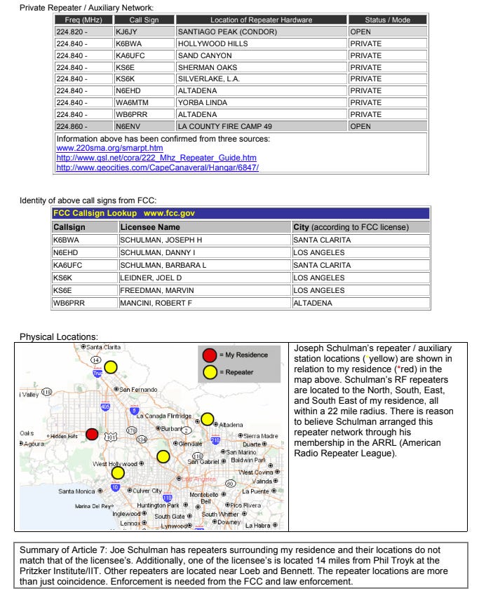 The Larson Report identifies that 200 MHz is the optimal frequency for penetrating human tissue impedance. An FCC database search revealed that Joseph Schulman and his associates set up a network of ham radio repeaters broadcasting at exactly 224.840 MHz.