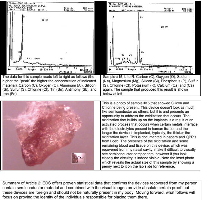 Forensic Confirmation: Energy Dispersive Spectroscopy (EDS) analysis conducted at Photometrics confirmed the presence of semiconductor materials, including Silicon, which is not naturally present in the human body. The EDS analysis also detected Chlorine, Tin, and Aluminum—materials actively utilized in semiconductor chip processing.